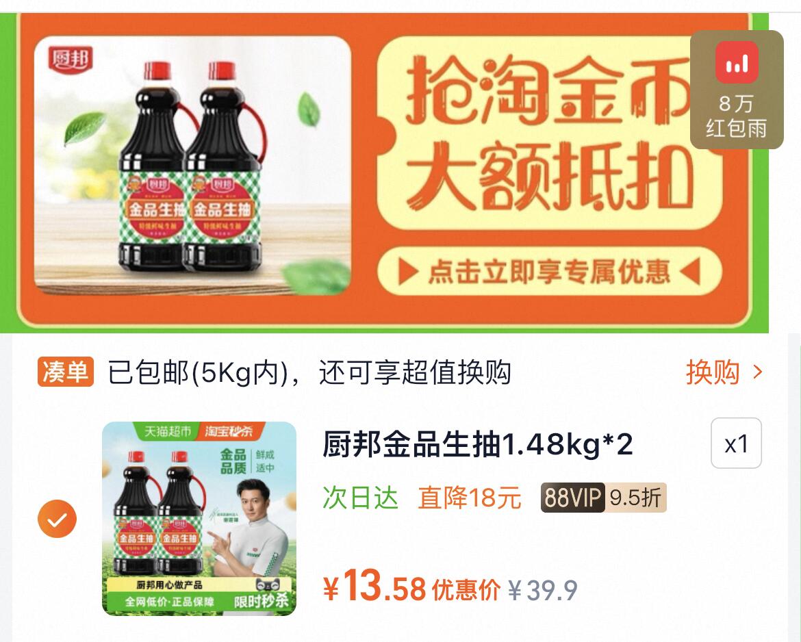 下拉详情拍,13.5亓(6.7/瓶) 厨邦金品生抽1.48kg*2瓶 好单发报员 2025年11月24日 20:11 0 举报 下拉详情拍,13.5亓(6.7/瓶)厨邦金品生抽1.48kg*2瓶https://m.tb.cn/h.SD5RanH 复制文案