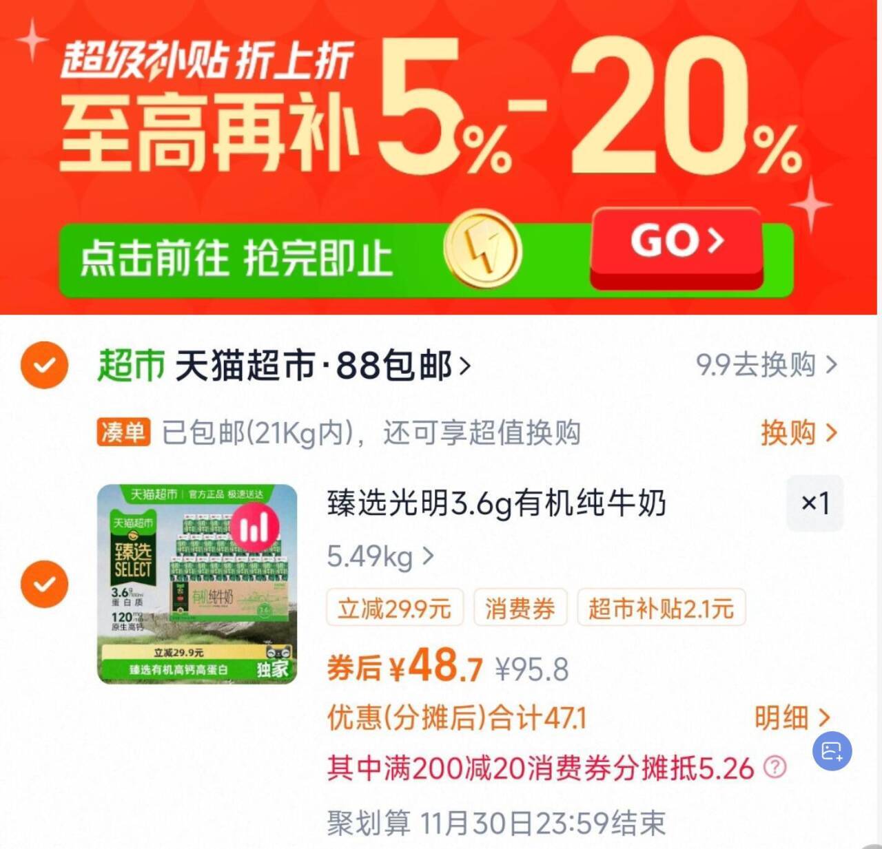 光明有机纯牛奶200mL*24盒