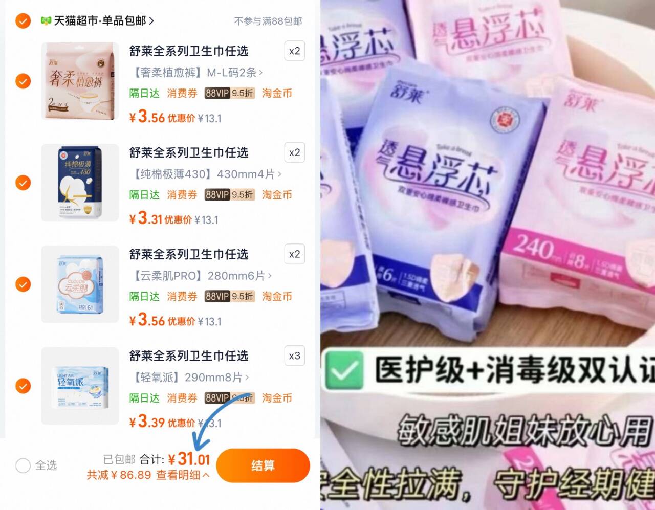 拍件31元下拉淘金币 【舒莱】全周期卫生巾任选 高端系列、这波真的很值 - 线报酷