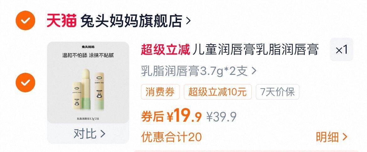拍第一选项 19.9亓,9.9/支 兔头妈妈 儿童润唇膏2支 好单发报员 2025年11月25日 15:07 0 举报 拍第一选项19.9亓,9.9/支兔头妈妈 儿童润唇膏2支https://m.tb.cn/h.SDLWyKz 复制文案