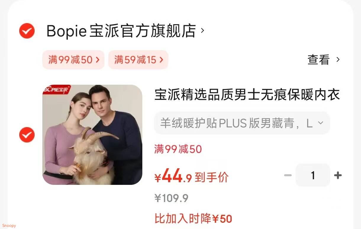 宝派 精选品质男士无痕保暖内衣套装 羊绒暖护贴PLUS版【44.9】