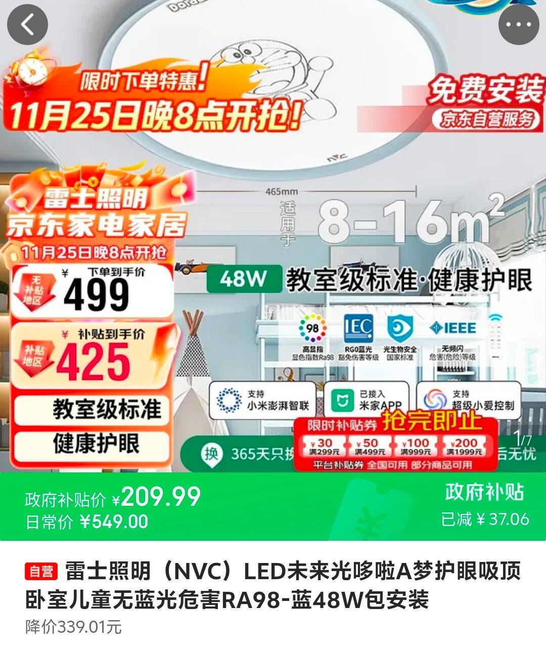 雷士照明 (NVC)LED未来光哆啦A梦护眼吸顶无蓝光危害RA98-蓝48W包安装,國补后209