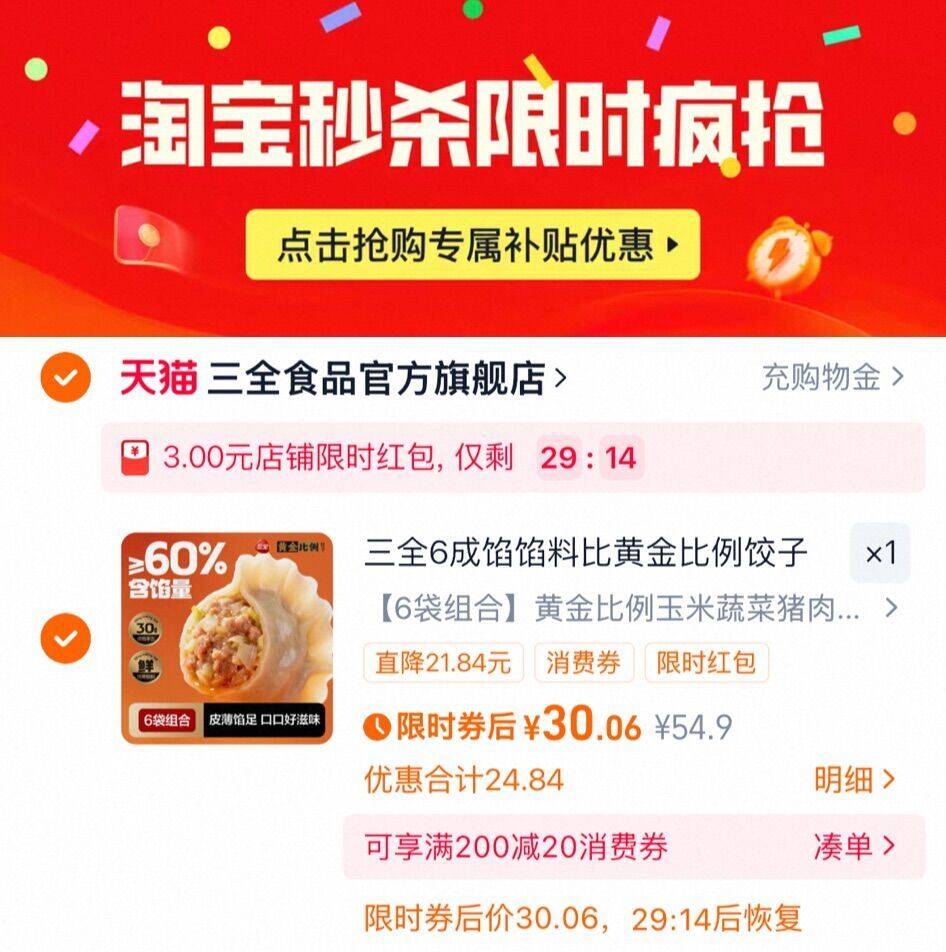 下拉详情拍 限时30,折5亓/袋 三全 多口味水饺400g*6袋 好单发报员 2025年11月26日 09:26 0 举报 下拉详情拍限时30,折5亓/袋三全 多口味水饺400g*6袋https://m.tb.cn/h.SxdzcJi 复制文案