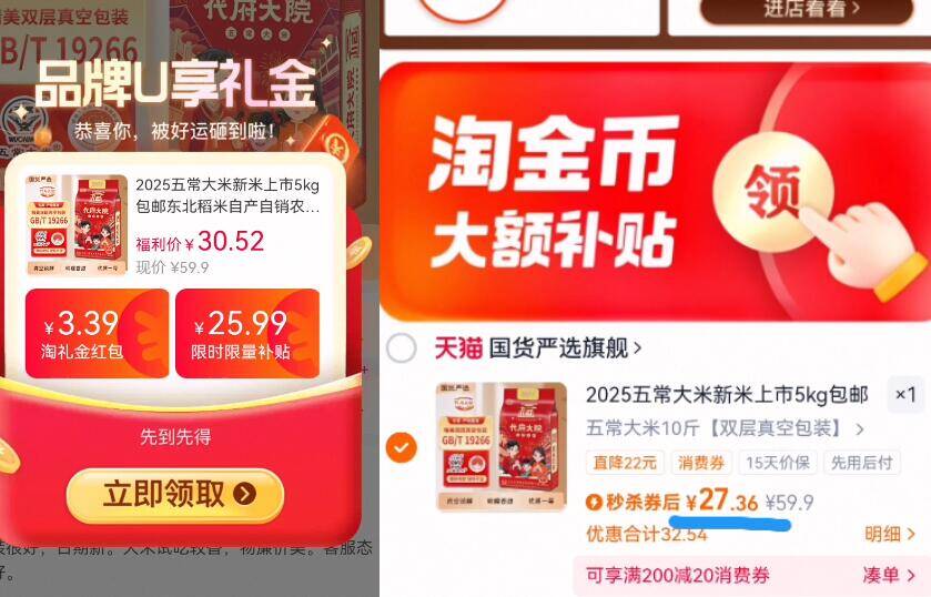 限时礼金折2.7亓/斤 下拉详情页拍下27.3亓 代府大院东北五常大米10斤 好单发报员 2025年11月26日 16:09 0 举报 限时礼金折2.7亓/斤下拉详情页拍下27.3亓代府大院东北五常大米10斤https://m.tb.cn/h.SxQRp5j 复制文案