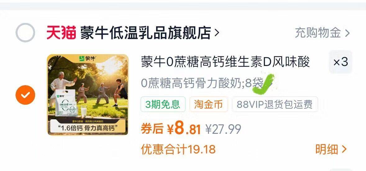 拍3件26亓,折1亓/袋 蒙牛0蔗糖高钙酸奶共24袋 好单发报员 2025年11月26日 23:39 0 举报 拍3件26亓,折1亓/袋蒙牛0蔗糖高钙酸奶共24袋https://m.tb.cn/h.SxgoBVK 复制文案