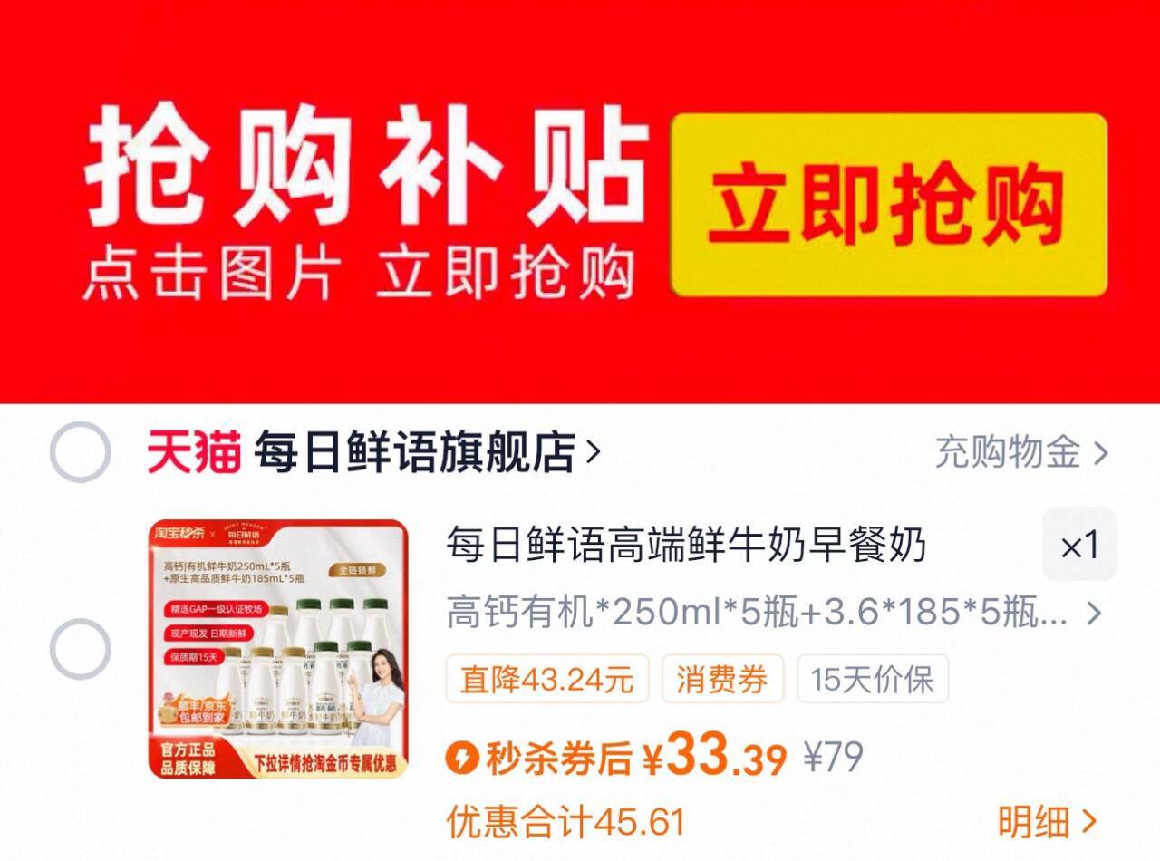 下拉详情拍,33.3亓 每日鲜语 高钙有机*250ml*5瓶 3.6*185*5瓶好单发报员2025年11月28日 21:340举报 下拉详情拍,33.3亓每日鲜语 高钙有机*250ml*5瓶 3.6*185*5瓶https://m.tb.cn/h.SCsxJhv复制文案