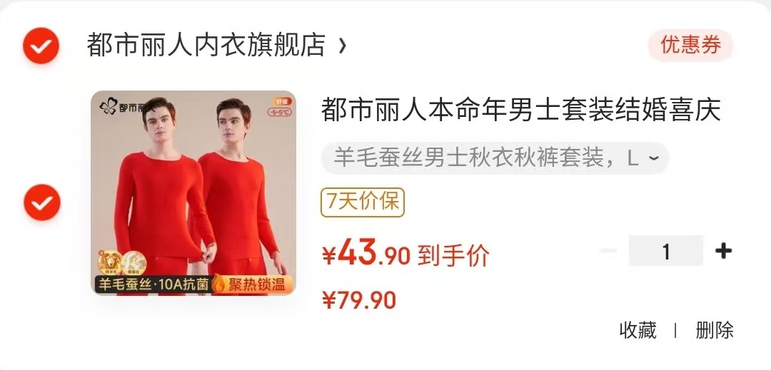 刚需,都市丽人 本命年 羊毛蚕丝男士秋衣秋裤套装【43.9】