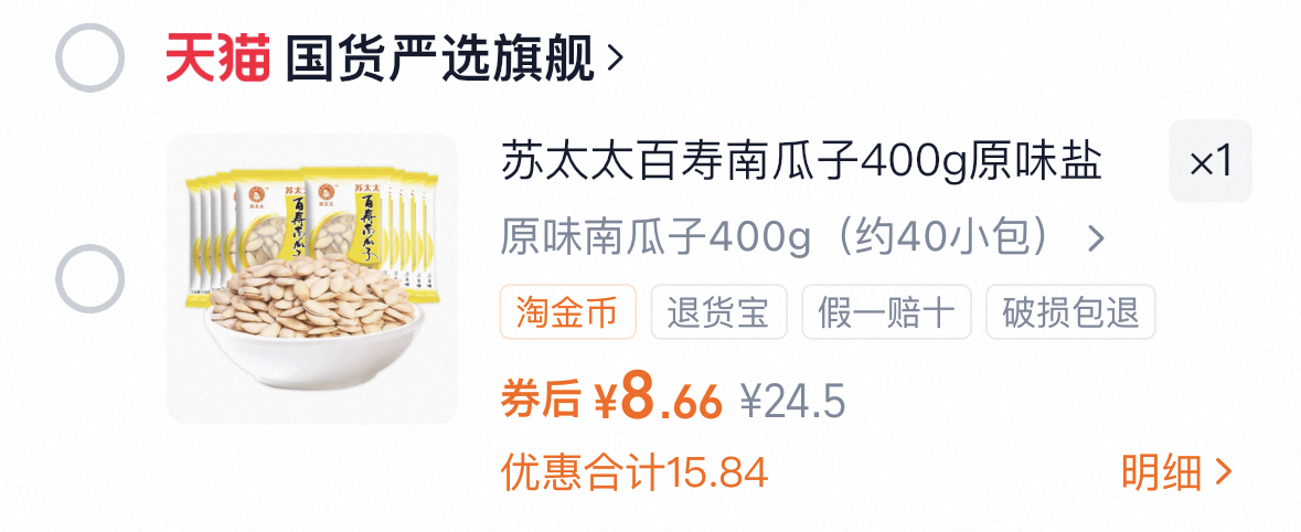 下拉详情拍 8.6 苏太太百寿南瓜子400g 好单发报员 2025年11月29日 16:26 0 举报 下拉详情拍 8.6苏太太百寿南瓜子400ghttps://m.tb.cn/h.SBF0g60 复制文案