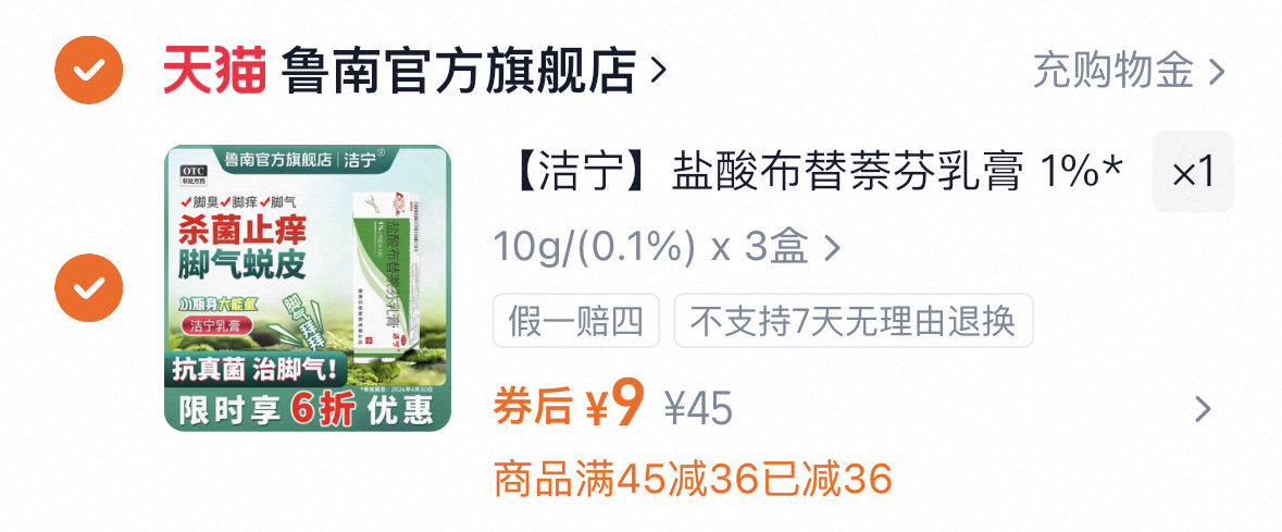 拍3盒选项=9亓 洁宁盐酸布替萘芬乳脚气膏 好单发报员 2025年11月29日 16:35 0 举报 拍3盒选项=9亓洁宁盐酸布替萘芬乳脚气膏https://m.tb.cn/h.SBagA3G 复制文案
