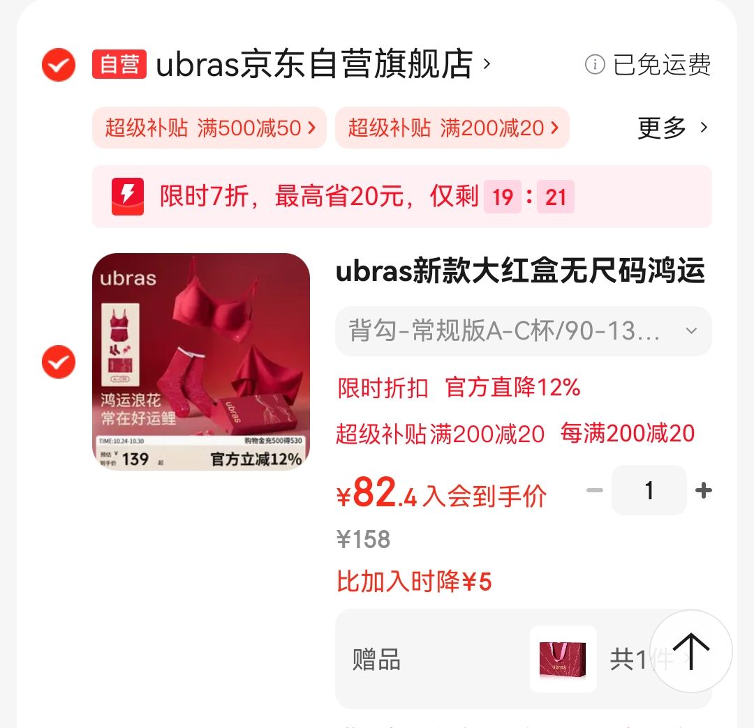 ubras新款大红盒无尺码鸿运浪花领免拆文胸内衣礼盒本命年马年-常规版
