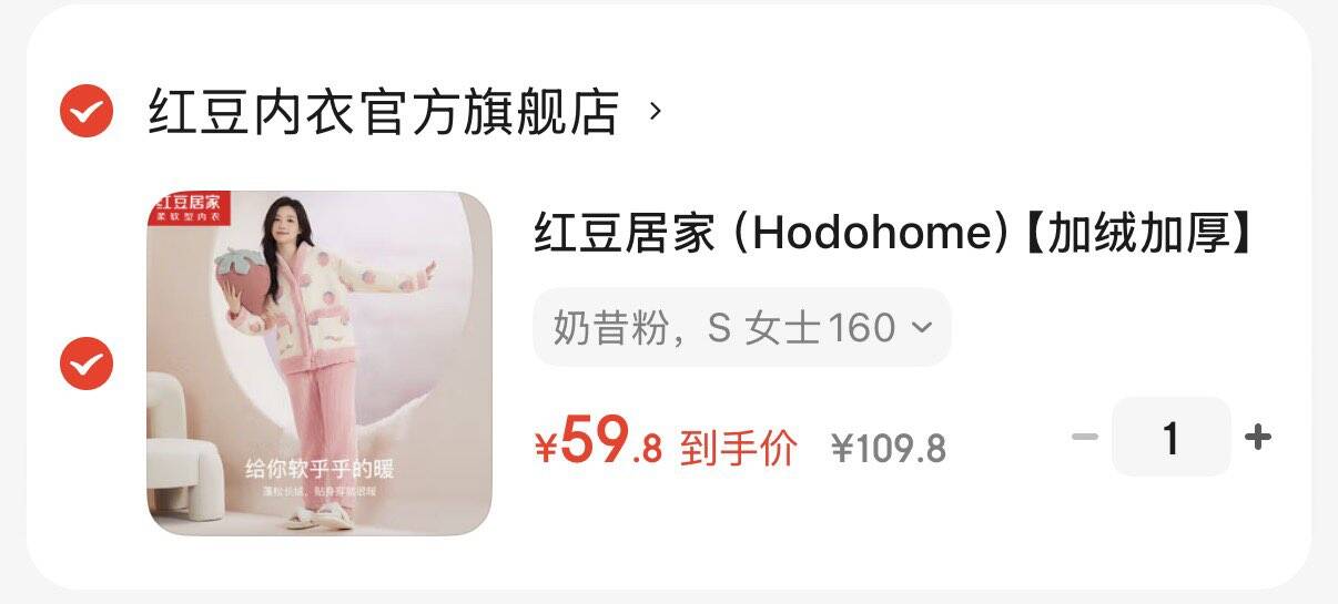 红豆加绒加厚睡衣套装 59.8亓