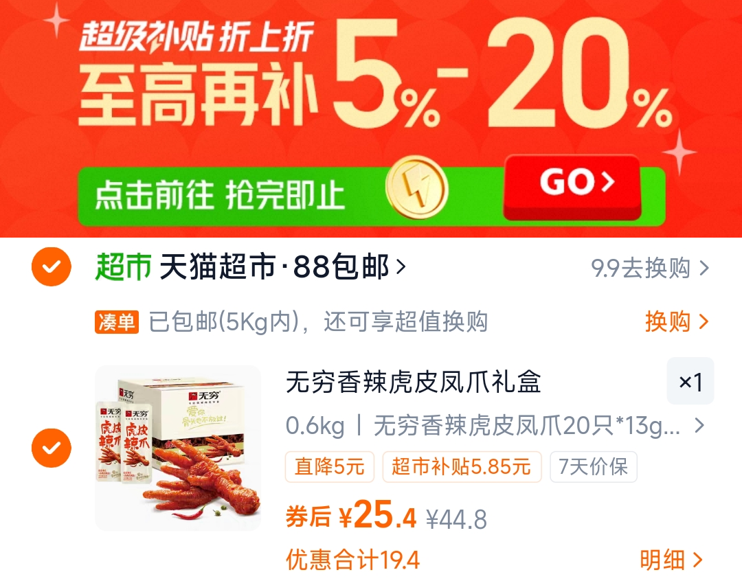 下拉详情拍,25.4亓 1.2亓/只 无穷香辣虎皮凤爪20只 好单发报员 2025年11月30日 13:43 0 举报 下拉详情拍,25.4亓 1.2亓/只无穷香辣虎皮凤爪20只https://m.tb.cn/h.SBSKl5O 复制文案