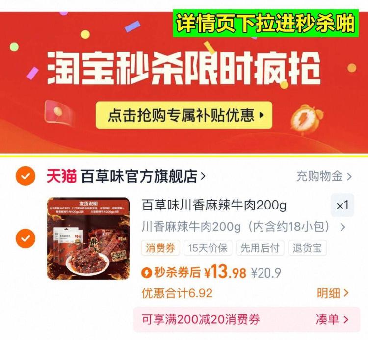 百草味麻辣牛肉200g13元.9 下滑详情,到秒杀页面拍 - 好单发报员 2025年11月30日 17:37 0 举报 百草味麻辣牛肉200g13元.9下滑详情,到秒杀页面拍-这可是百草味爱吃的冲到手小半斤了,这忦蛮不错毕竟超市生牛肉都四五十/斤https://m.tb.cn/h.SBYyoVH 复制文案