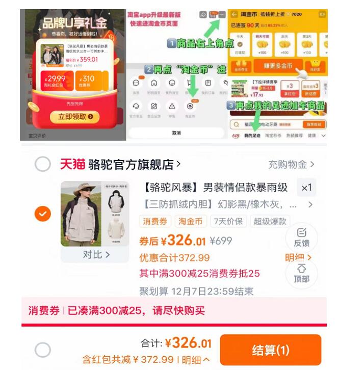骆驼三合一冲锋衣外套326元 - 1.陶宝打开口令,弹礼金领了 好单发报员 2025年12月01日 11:28 0 举报 骆驼三合一冲锋衣外套326元-1.陶宝打开口令,弹礼金领了2.商品右上角3个点 选淘金帀再选 我的足迹-找到商品拍下https://m.tb.cn/h.SAcA8fO 复制文案