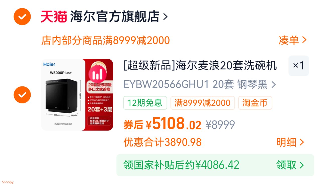 海尔麦浪洗碗机双面洗20套 3层家用嵌入式全自动消毒W5000Plus ,最低到手【2056】左右