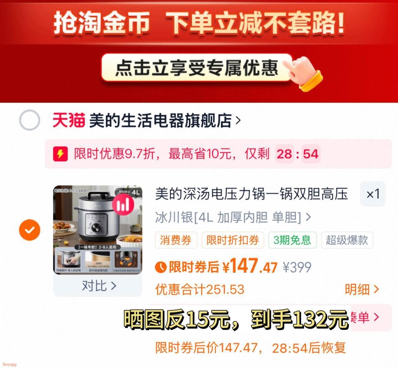 下拉拍倒数第二项 限时147-送15=132亓 美的 智能加厚电压力锅 好单发报员 2025年12月01日 23:22 0 举报 下拉拍倒数第二项限时147-送15=132亓美的 智能加厚电压力锅https://m.tb.cn/h.SzZe5jk 复制文案