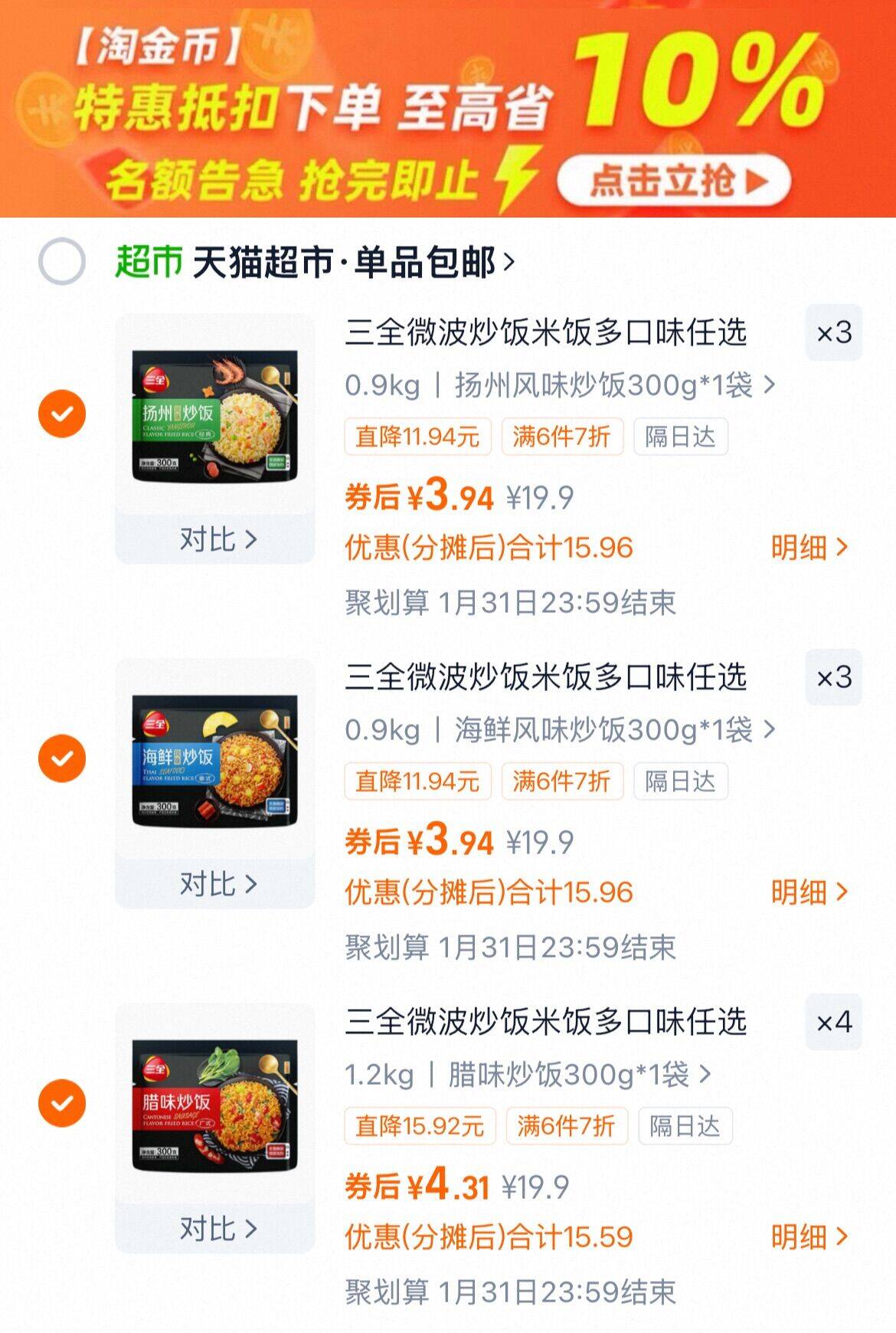 下拉详情拍10件 vip40.8亓,折4亓/件 三全 扬州炒饭馄饨任选 好单发报员 2025年12月02日 09:49 0 举报 下拉详情拍10件vip40.8亓,折4亓/件【三全】扬州炒饭馄饨任选https://m.tb.cn/h.SzBWwRs 复制文案