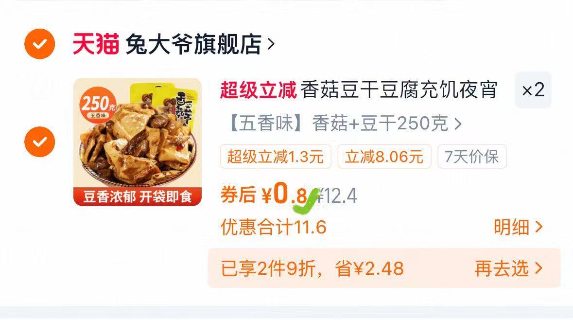 bug反复领2次劵 香菇豆干 2件1.6