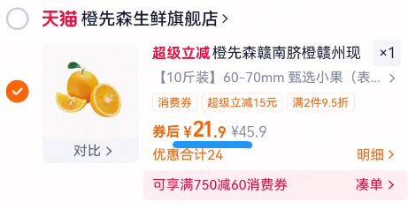 2.1亓/斤神圿拍第1选项 到手21.9亓!单果60-70mm 橙先森宗赣南高山新鲜脐橙10斤 好单发报员 2025年12月02日 14:15 0 举报 2.1亓/斤神圿拍第1选项到手21.9亓!单果60-70mm橙先森宗赣南高山新鲜脐橙10斤https://m.tb.cn/h.SzjpGhb 复制文案