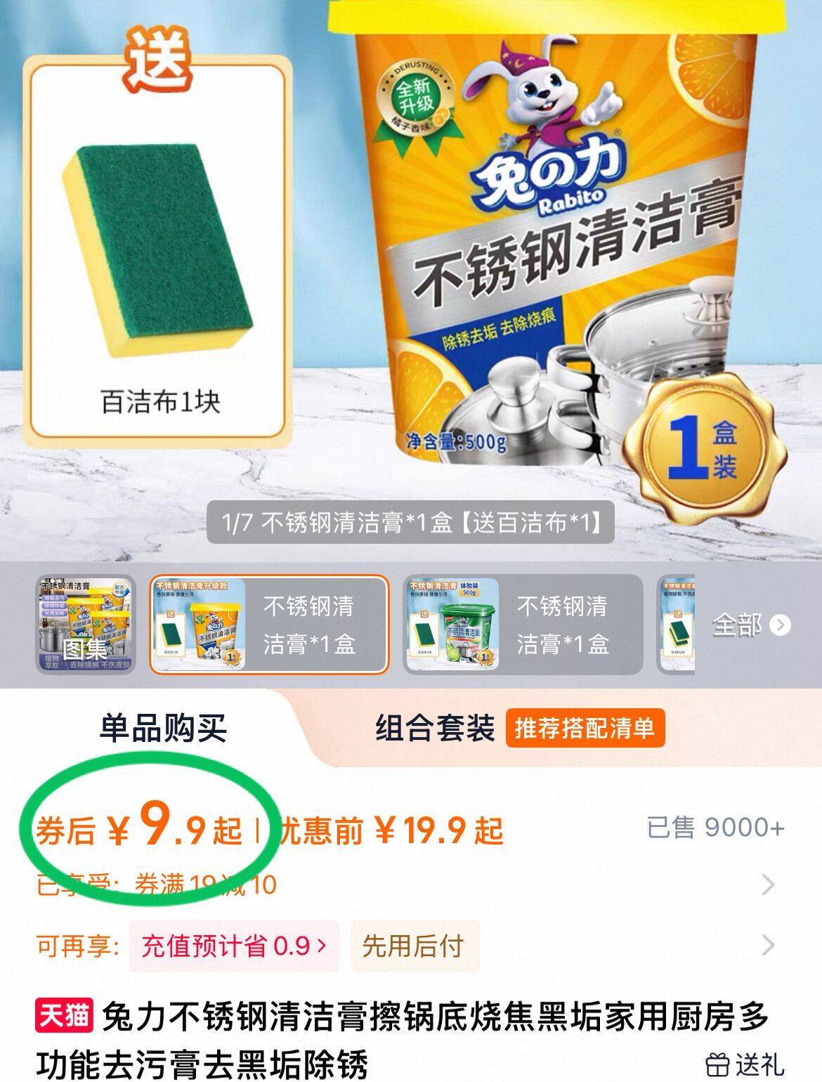9.9亓500g!赠百洁布 兔力 不锈钢.清洁膏1盒 有效除锈迹、去垢、除烧痕 好单发报员 2025年12月02日 14:30 0 举报 9.9亓500g!赠百洁布【兔力】不锈钢.清洁膏1盒有效除锈迹、去垢、除烧痕擦完的效果跟新的一样啊-https://m.tb.cn/h.SAzdVjG 复制文案