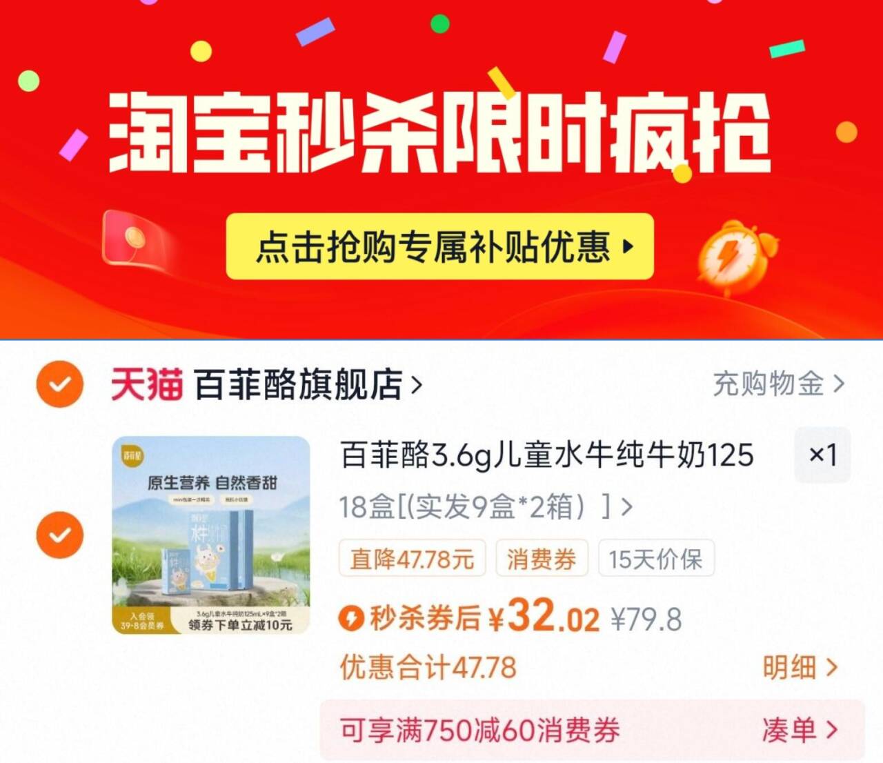 下拉详情拍,32亓 百菲酪水牛纯牛奶125ml*9盒*2箱 好单发报员 2025年12月03日 10:05 0 举报 下拉详情拍,32亓百菲酪水牛纯牛奶125ml*9盒*2箱https://m.tb.cn/h.SA8uyCJ 复制文案