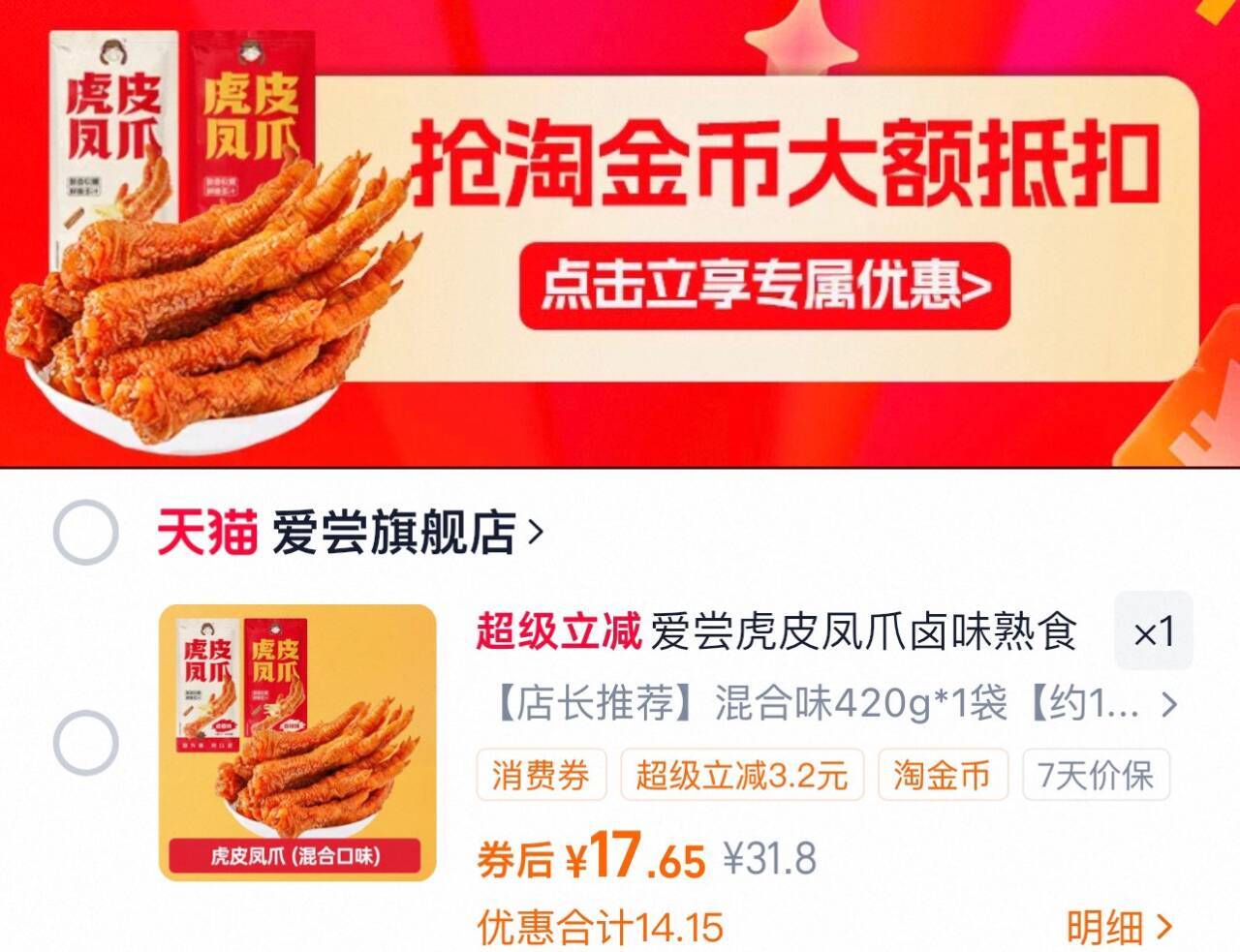 下拉详情拍,17.6亓 爱尝 虎皮凤爪420g 约16只好单发报员2025年12月03日 22:310举报 下拉详情拍,17.6亓爱尝 虎皮凤爪420g 约16只https://m.tb.cn/h.SA9YMkZ复制文案