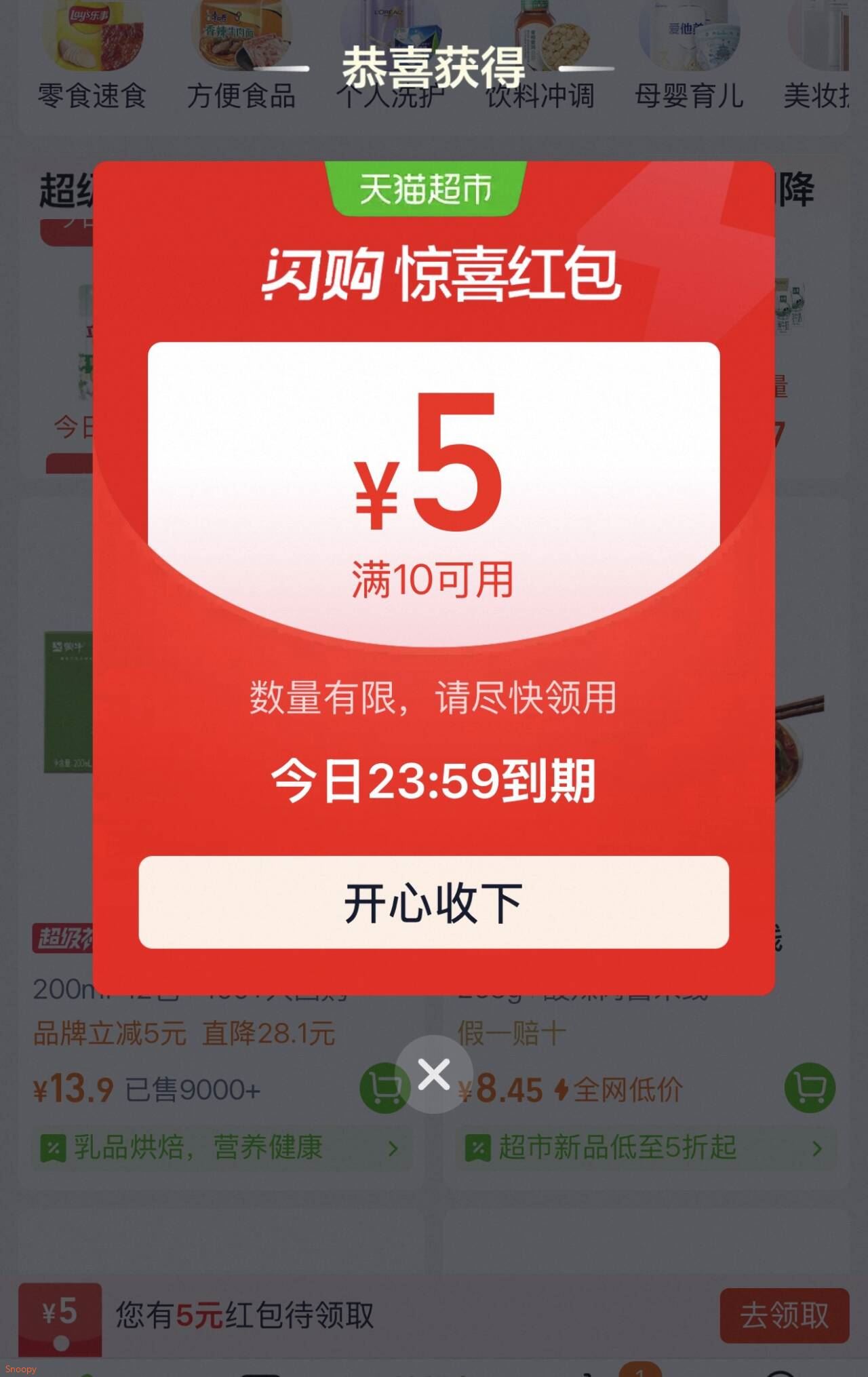 猫超 超市首页概率弹10-5红包