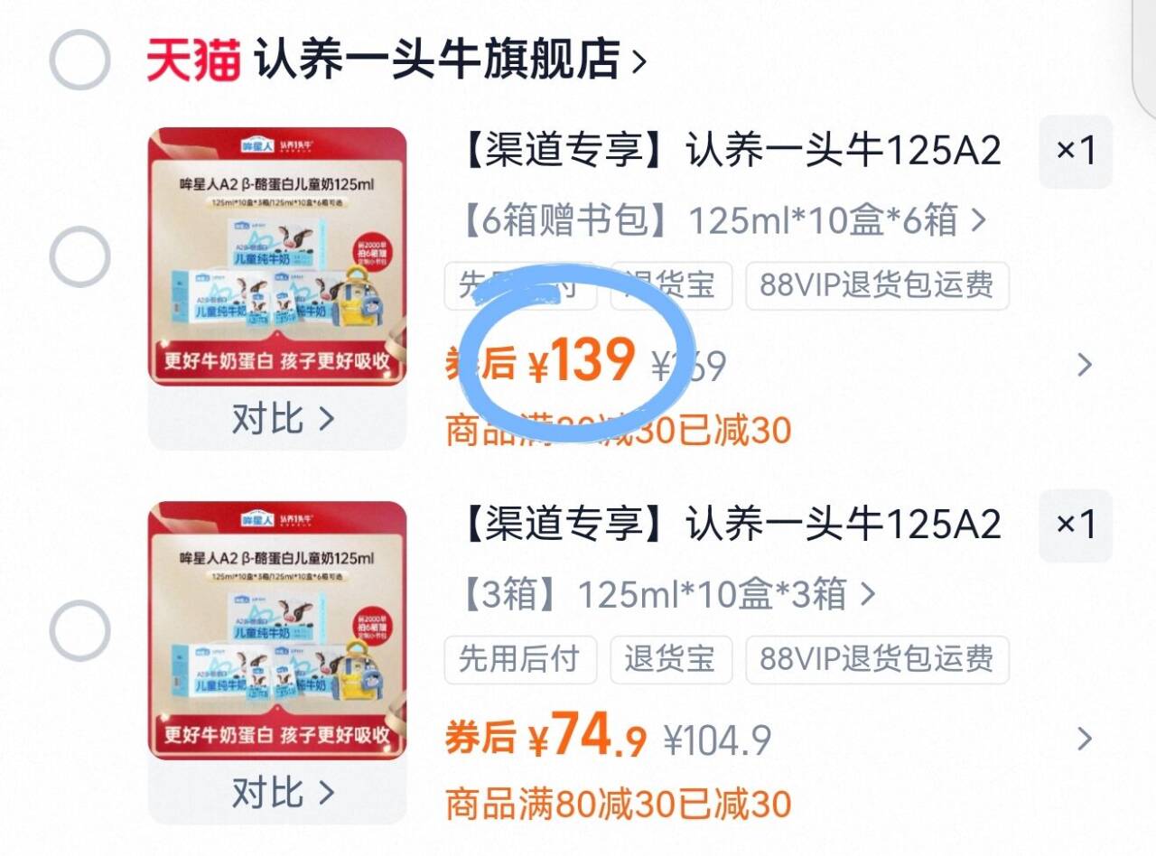 认养一头牛哞星人A2β儿童奶 125ml3箱装74元.930盒 125ml6箱装13960元盒 好单发报员 2025年12月06日 09:15 0 举报 认养一头牛哞星人A2β儿童奶125ml3箱装74元.930盒125ml6箱装13960元盒https://m.tb.cn/h.70KzgZe 复制文案