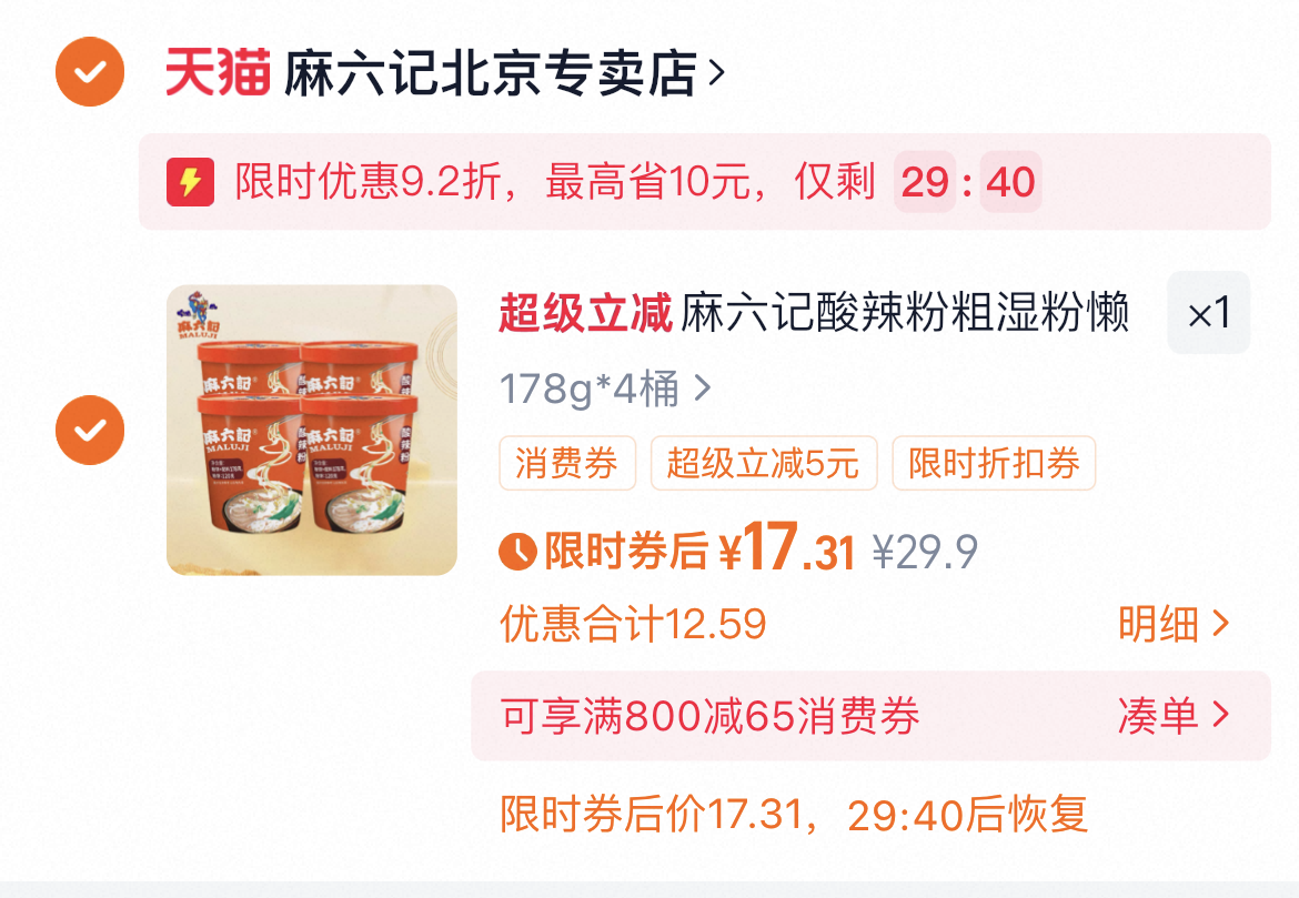 17亓 4.2/桶 有限时店铺虹包 麻六记酸辣粉178g*4桶 好单发报员 2025年12月06日 16:17 0 举报 17亓(4.2/桶)有限时店铺虹包麻六记酸辣粉178g*4桶https://m.tb.cn/h.7ZGX7sM 复制文案