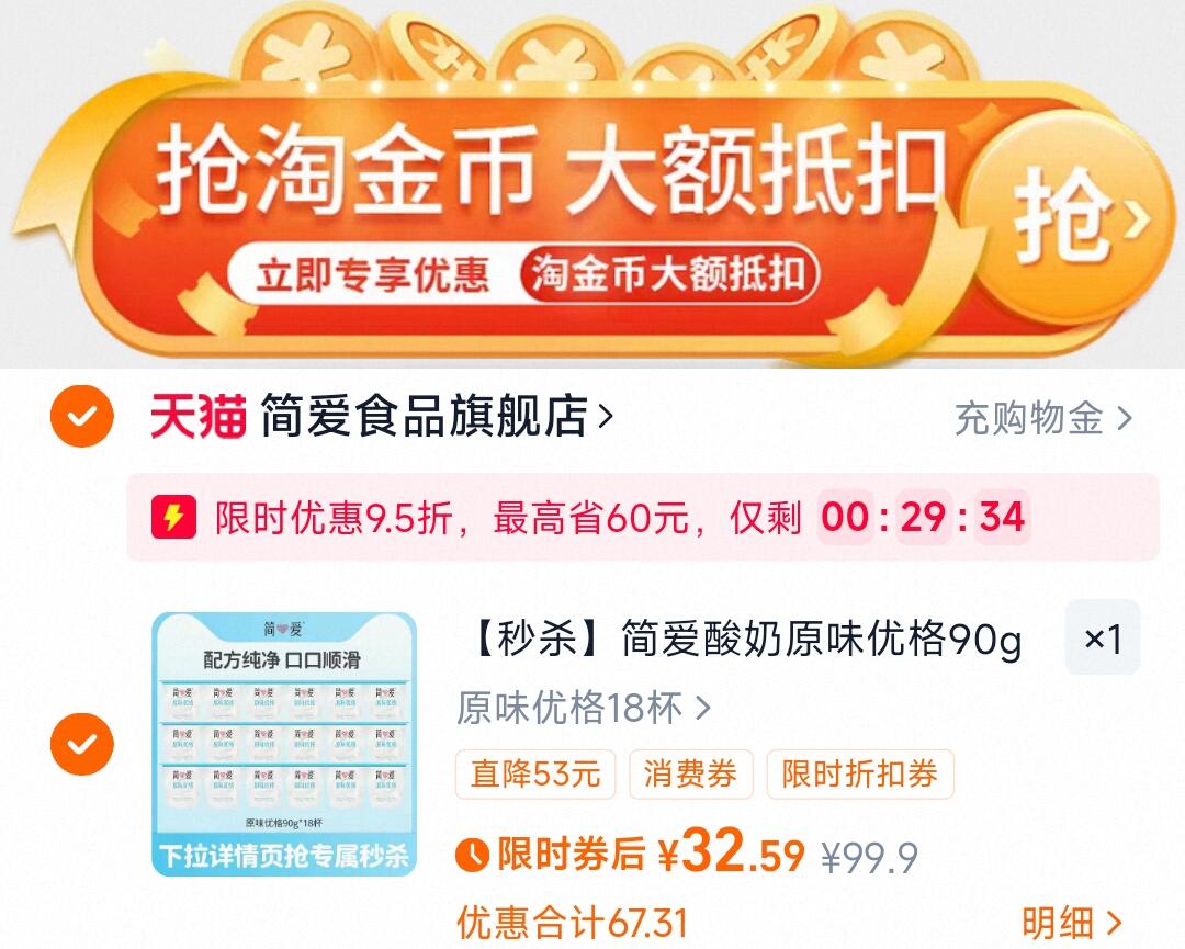 下拉详情拍 32.5亓 1.8/杯 简爱优格酸奶90g*18杯 好单发报员 2025年12月07日 21:33 0 举报 下拉详情拍32.5亓(1.8/杯)简爱优格酸奶90g*18杯https://m.tb.cn/h.70oXpCl 复制文案