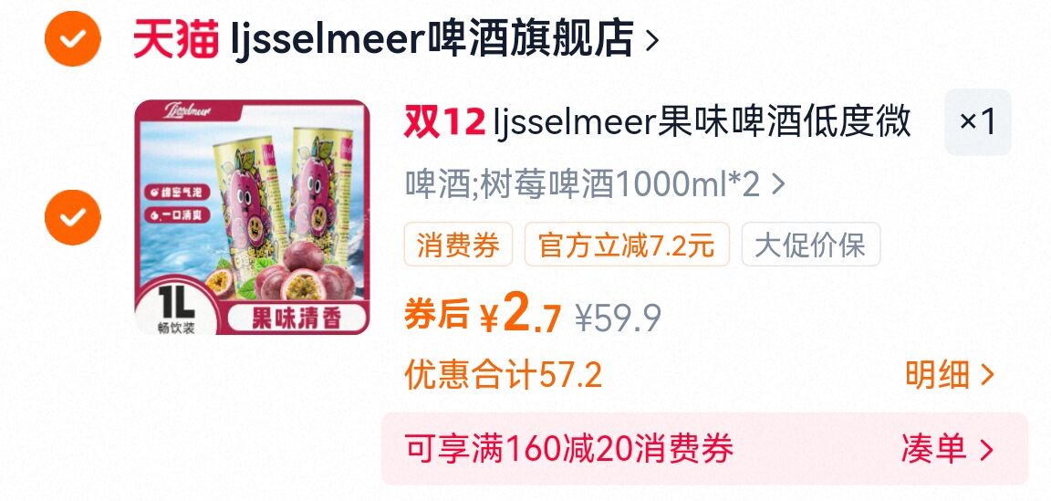 2.7亓,2大桶 Ijsselmeer果味啤酒低度 好单发报员 2025年12月08日 00:05 0 举报 2.7亓,2大桶Ijsselmeer果味啤酒低度https://m.tb.cn/h.70UDS6O 复制文案