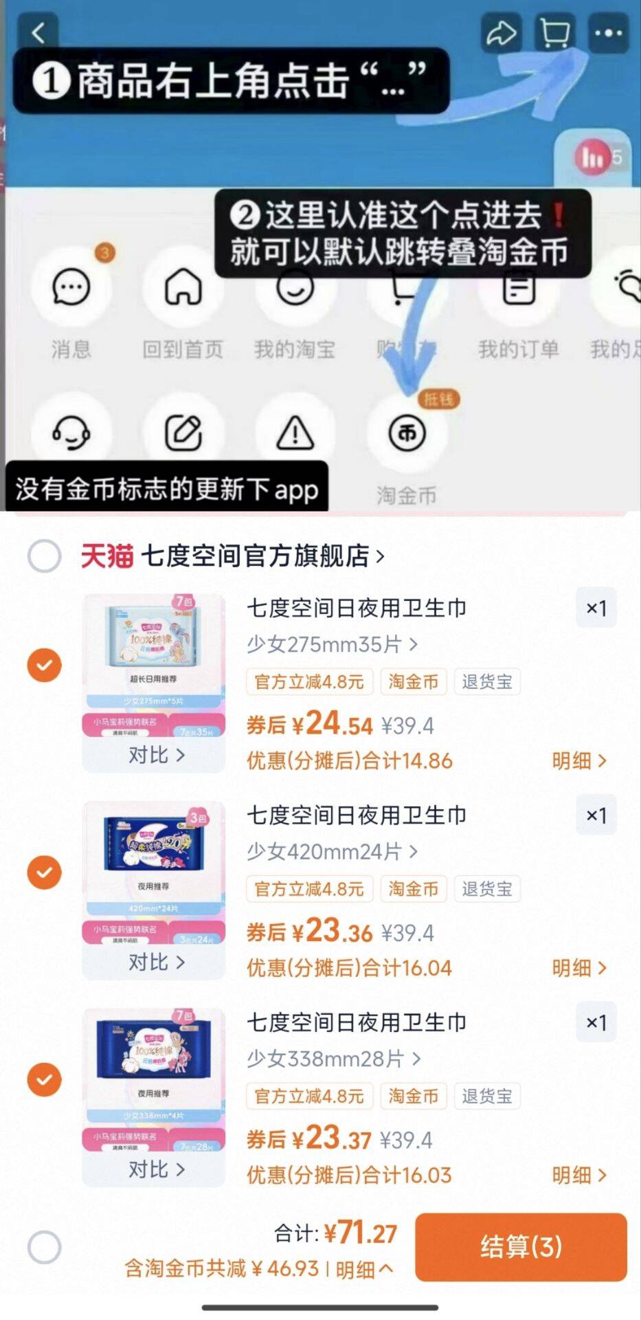 3件 任选3件 到手71.2元 七度空间旗舰店 七度空间卫生巾任选3件 好单发报员 2025年12月09日 19:14 0 举报 3件 任选3件 到手71.2元【七度空间旗舰店】七度空间卫生巾任选3件https://m.tb.cn/h.7bqo6gl00%纯棉 干爽不黏腻多规格都有 趁划蒜赶快囤 复制文案