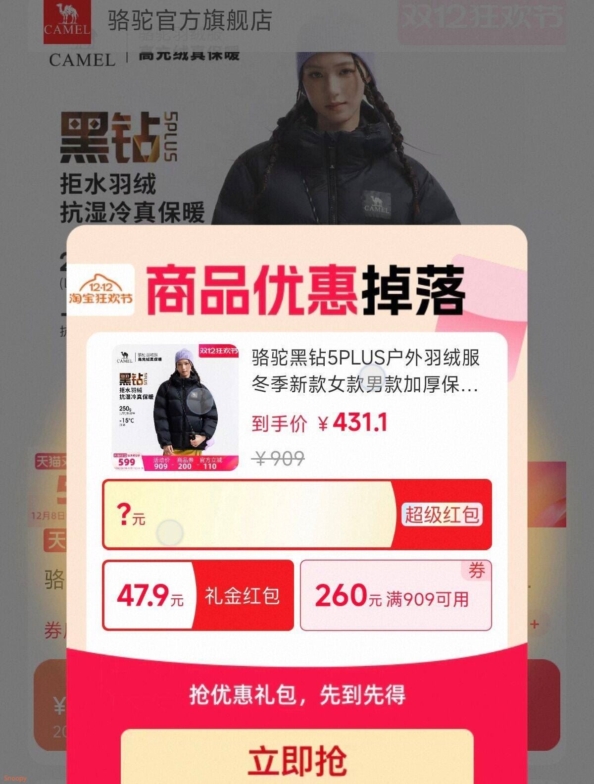 2骆驼黑钻5PLUS户外羽绒服