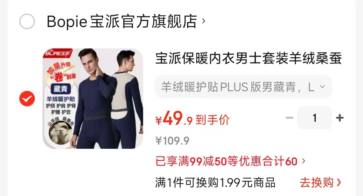 宝派 保暖内衣男士套装羊绒桑蚕丝PLUS版【49.9】