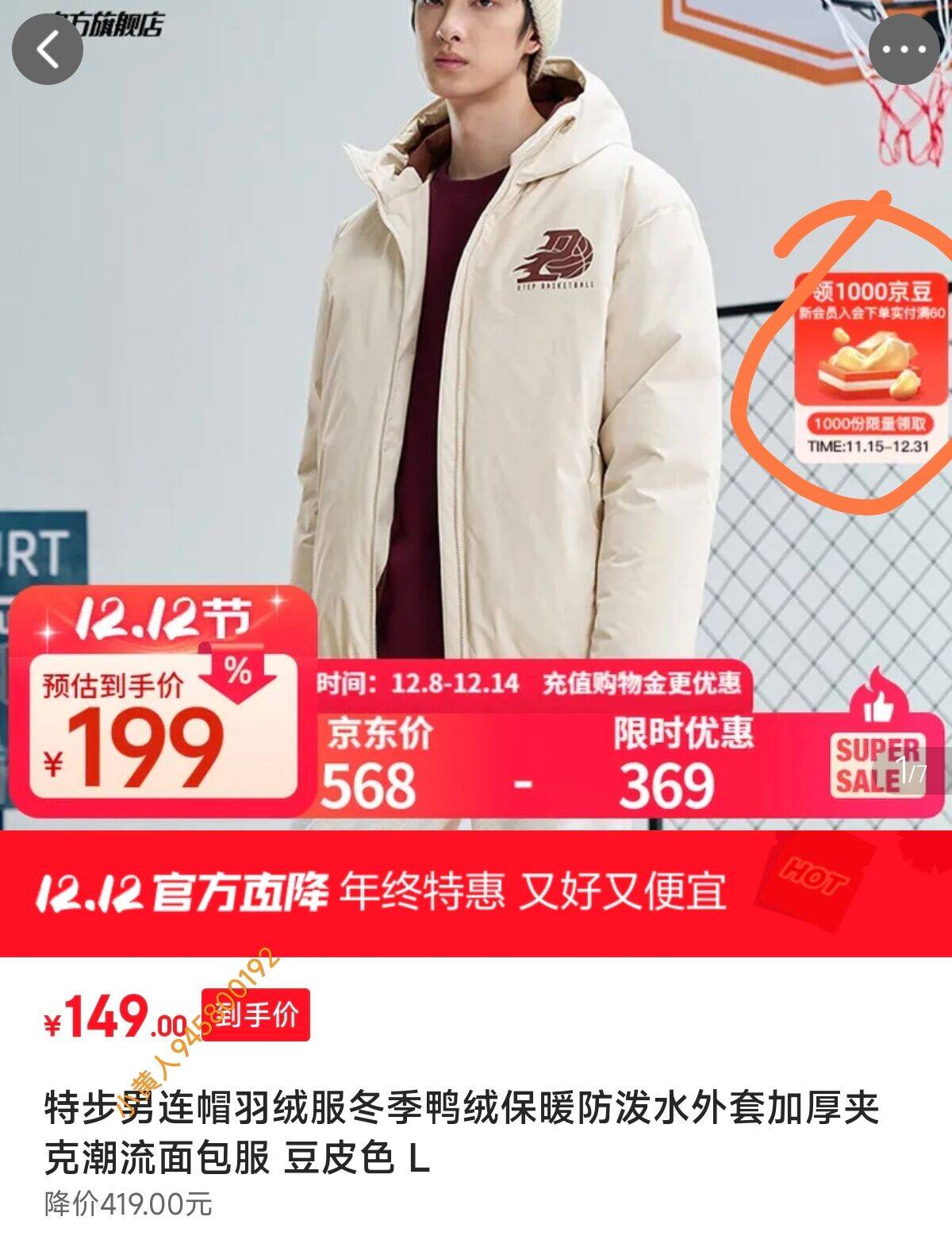 特步 男最高205g充绒羽绒服,返10元京豆到手139