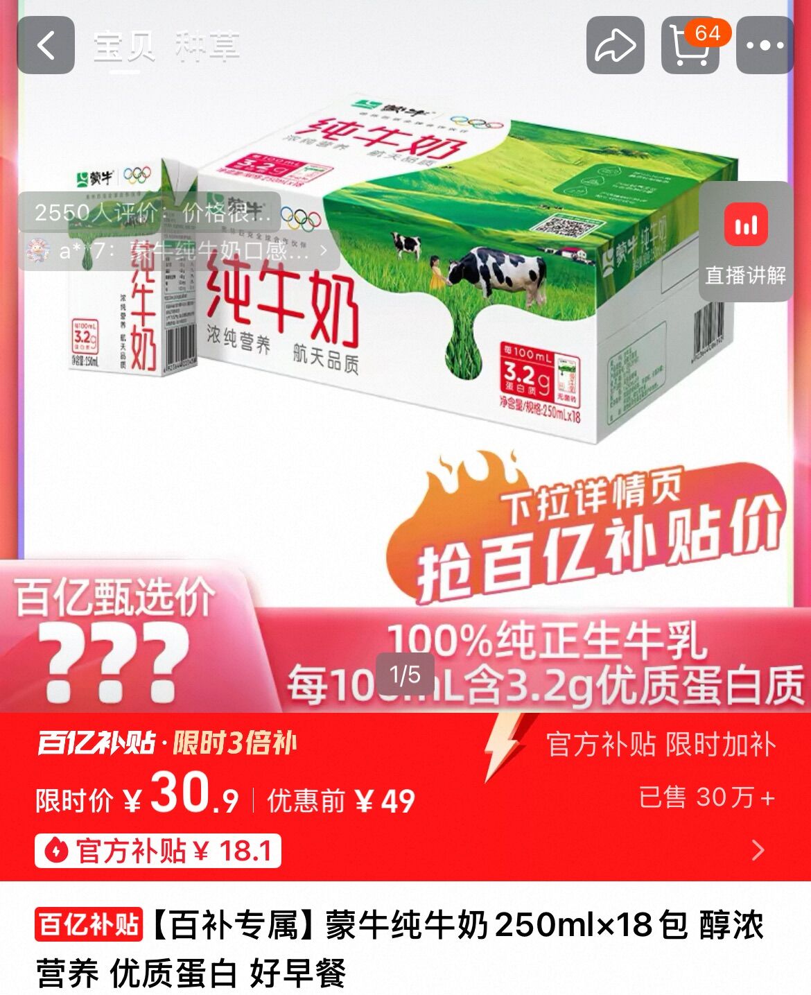 30.9亓百补 蒙牛纯牛奶250ml*18盒