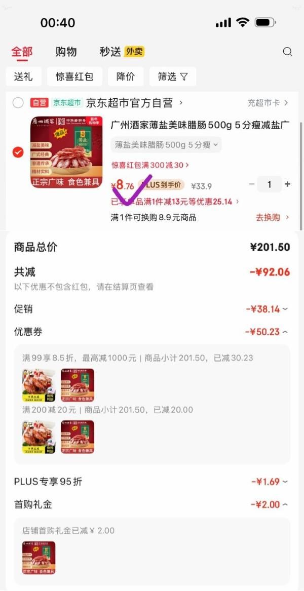 黑五200-20券 广州酒家薄盐美味腊肠500g 5分瘦减盐 2首单,凑后 8.76
