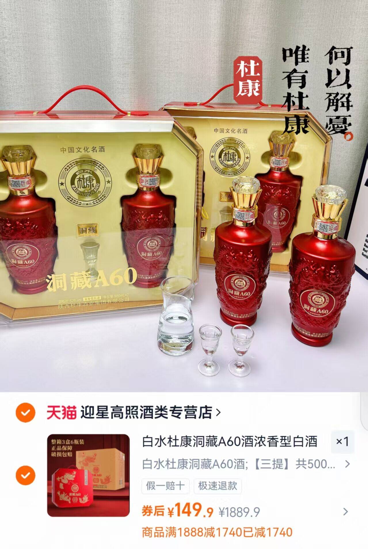 白水杜康洞藏A60浓香型 52°白酒500ml*2瓶礼盒 -好单发报员2026年01月22日 15:500举报 白水杜康洞藏A60浓香型52°白酒500ml*2瓶礼盒-149元.93提装贈茅台同款酒杯*6只https://m.tb.cn/h.7nsxkk5复制文案