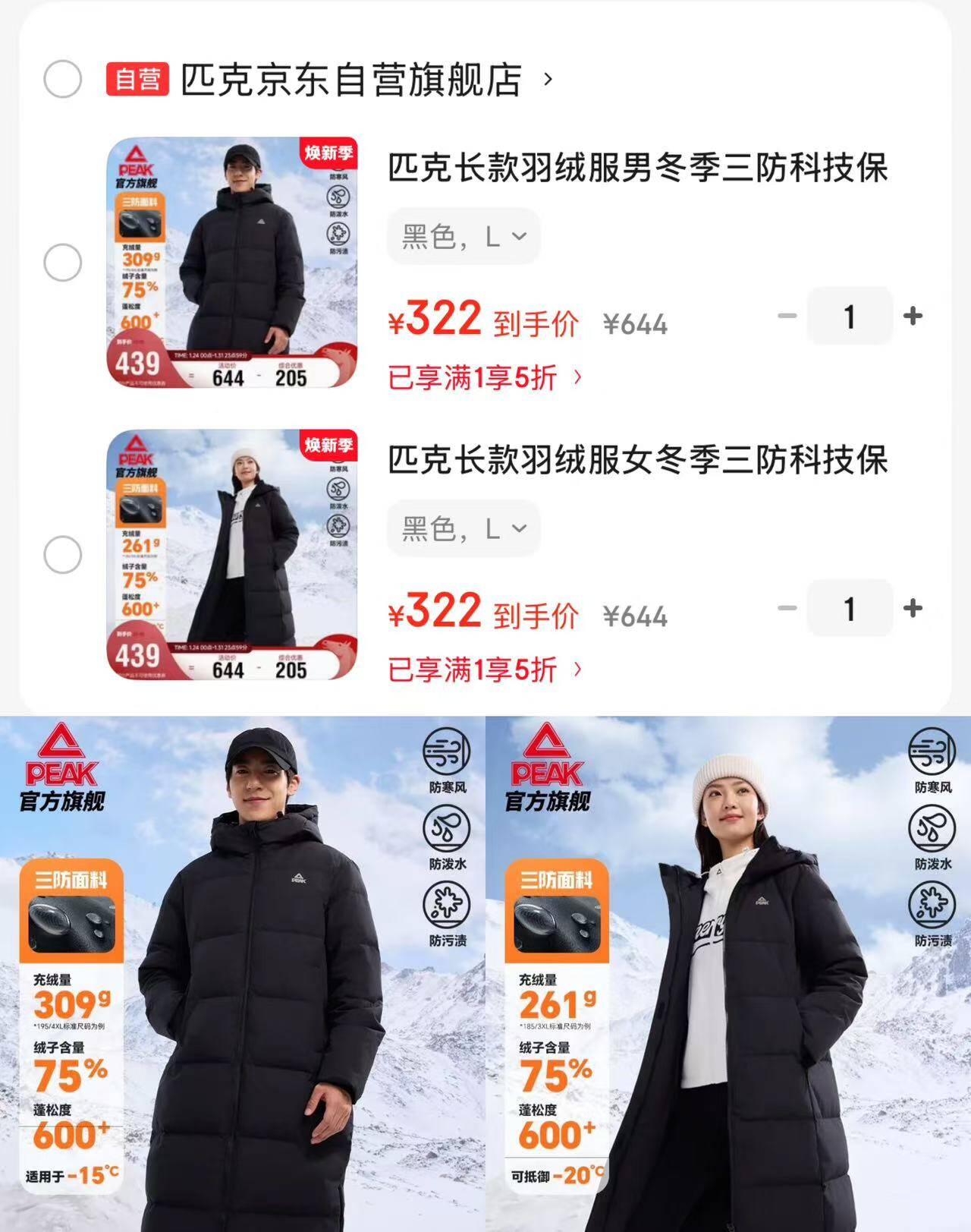 匹克 长款羽绒服5折322元
