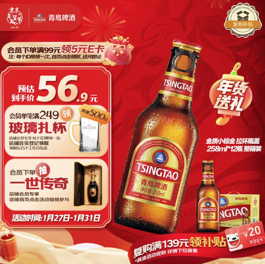 青岛啤酒(TsingTao)精酿小棕金 拉环瓶盖设计 258ml*12瓶 整箱装 年货送礼