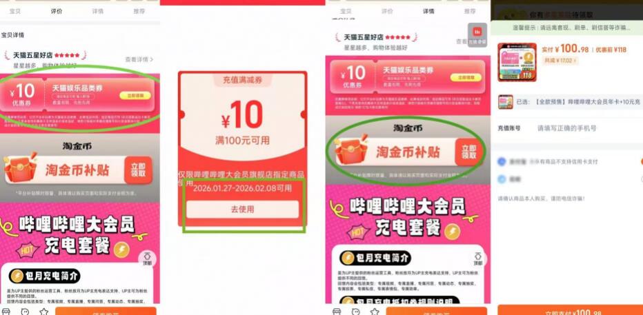 100.98】哔哩哔哩 大会员年卡 全站up主通用10亓充电券*3张