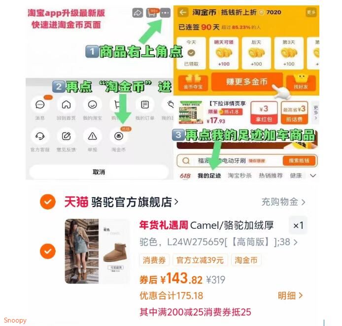 骆驼加绒保暖雪地靴143元 若叠购物金,到手价更低 -好单发报员2026年02月04日 10:320举报 骆驼加绒保暖雪地靴143元若叠购物金,到手价更低-1.复制到淘宝打开拿礼金2.商品右上3个点,选淘金币3.选 我的足迹-找到商品拍下https://m.tb.cn/h.7HJHS6n需叠88的200-25消费券才对复制文案