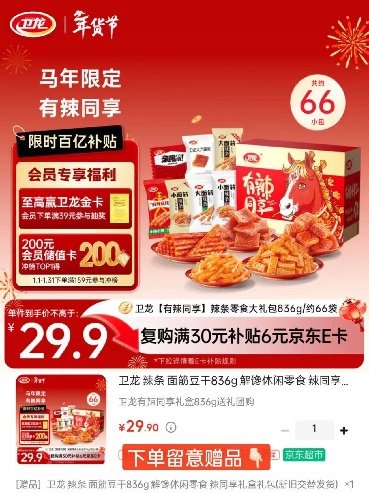 快卫龙买1送1 自营 卫龙 有辣同享辣条836g 29.9亓 云费,Plus无限包邮好单发报员2026年02月04日 10:580举报 ——快卫龙买1送1——【自营】卫龙 有辣同享辣条836ghttps://u.jd.com/J67DNgI29.9亓 云费,Plus无限包邮*赠同款辣条836g 才14.9/件*解馋过瘾 礼盒包装 送礼也行复制文案