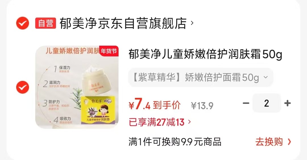 郁美净 儿童娇嫩倍护润肤霜50g,拍2件【14.8】 折7.4/瓶