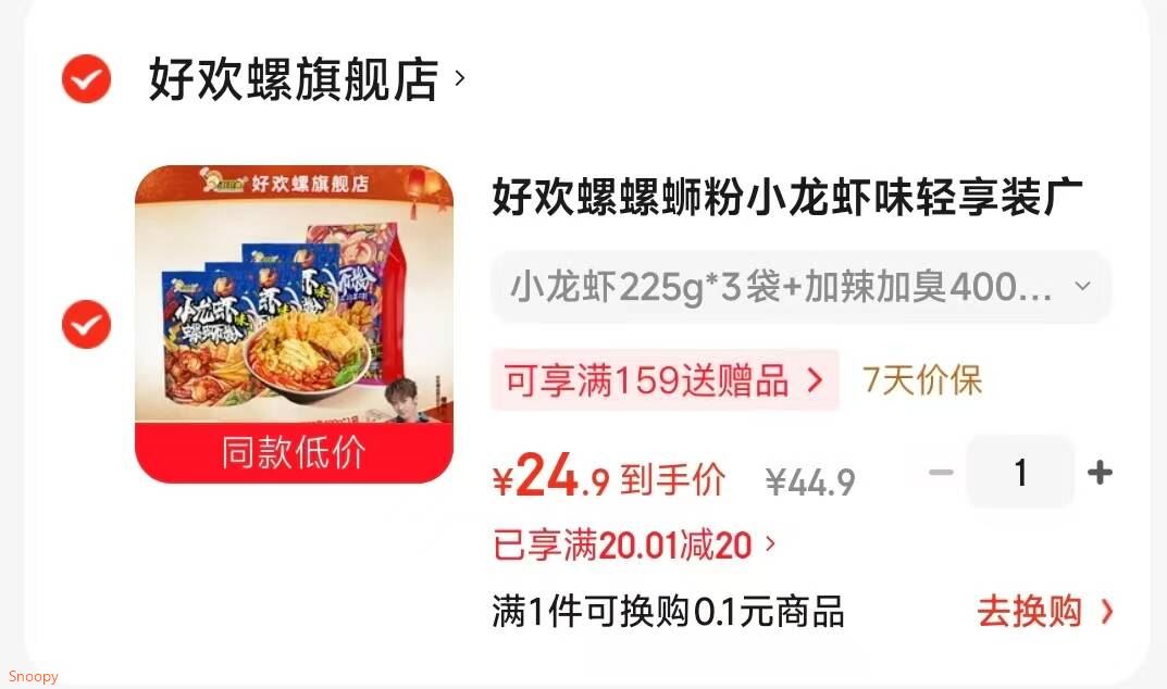 好欢螺 螺蛳粉小龙虾味 225g*3袋 加辣加臭400g*1袋【24.9】