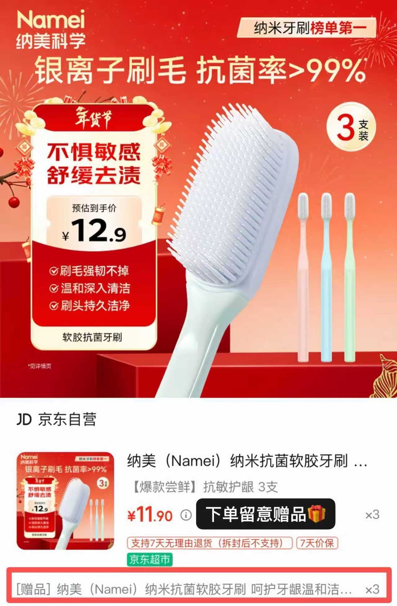 纳美牙刷发車 自营 纳美 纳米软胶牙刷3支 买3件30.3亓 u,新客再减2亓好单发报员2026年02月05日 14:390举报 ——纳美牙刷发車——【自营】纳美 纳米软胶牙刷3支https://u.jd.com/J1kzi28买3件30.3亓 u,新客再减2亓*赠软毛牙刷6支 才折1.8亓/支复制文案