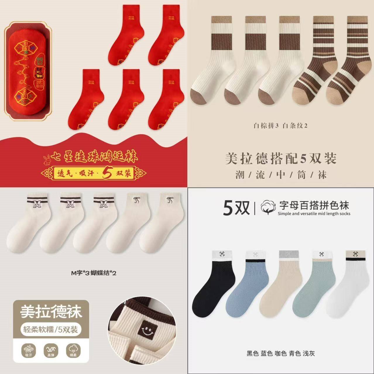 宜而爽 男女中筒红袜秋冬袜5双