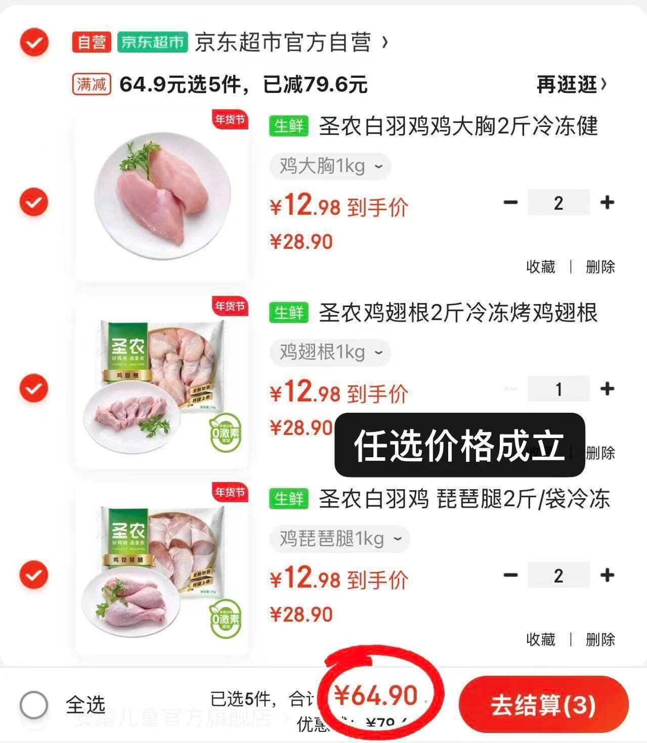 任选5件64.9亓,折6.4亓/斤