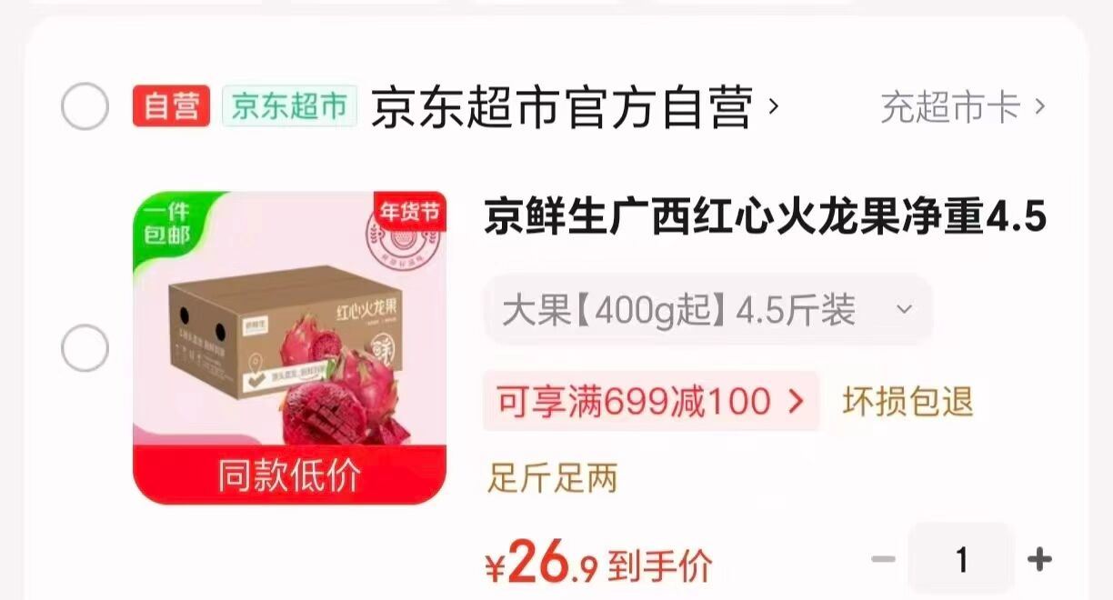 京鲜生红心火龙果4.5斤
