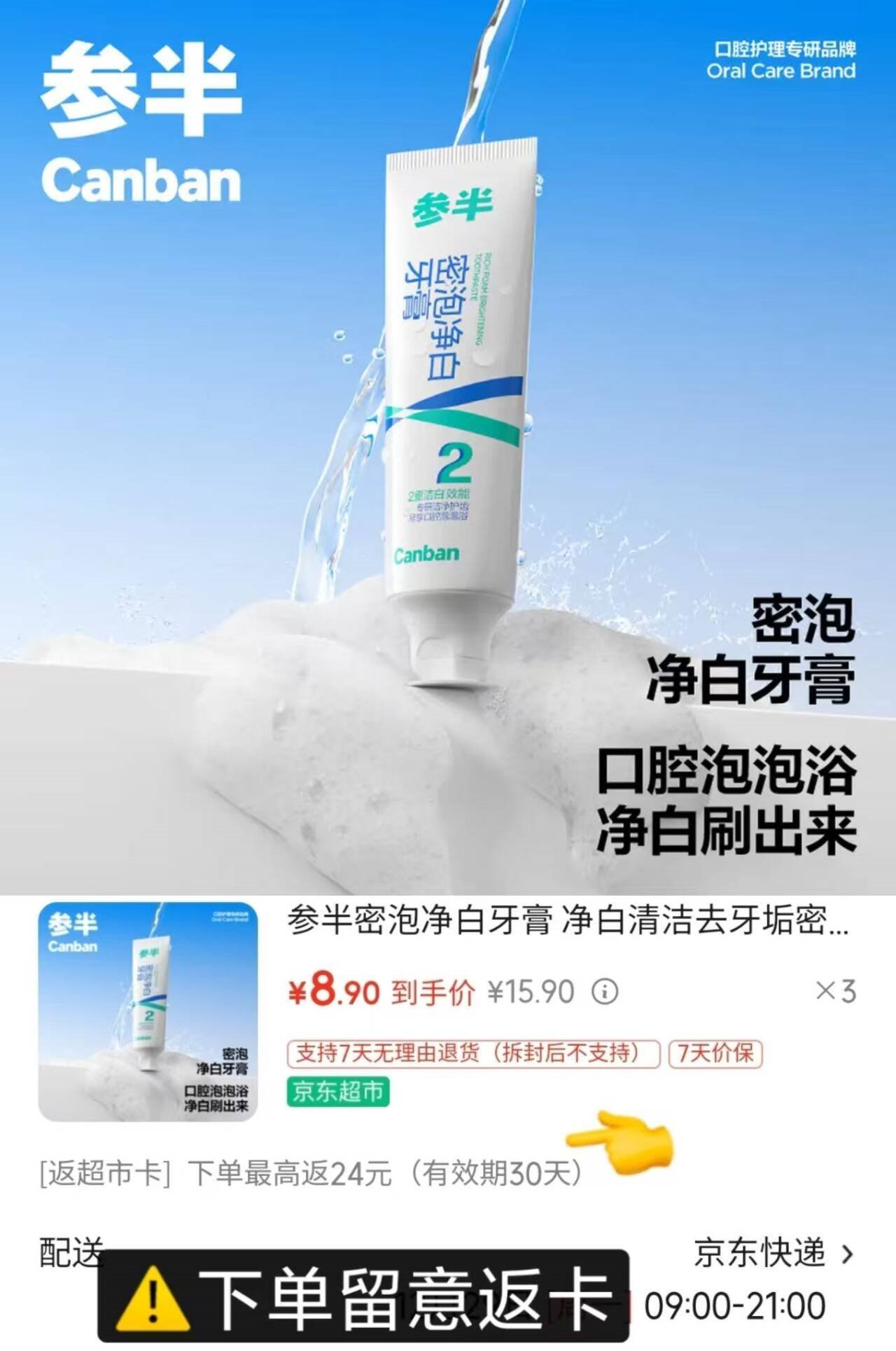 参半牙膏无敌忦 自营 参半 密泡净白牙膏60g 买3件26.7亓包邮,限时包邮 好单发报员 2026年02月05日 21:29 0 举报 ——参半牙膏无敌忦——【自营】参半 密泡净白牙膏60ghttps://u.jd.com/JD4MeLF买3件26.7亓包邮,限时包邮*反24亓超.市卡 才折0.9亓/支 复制文案